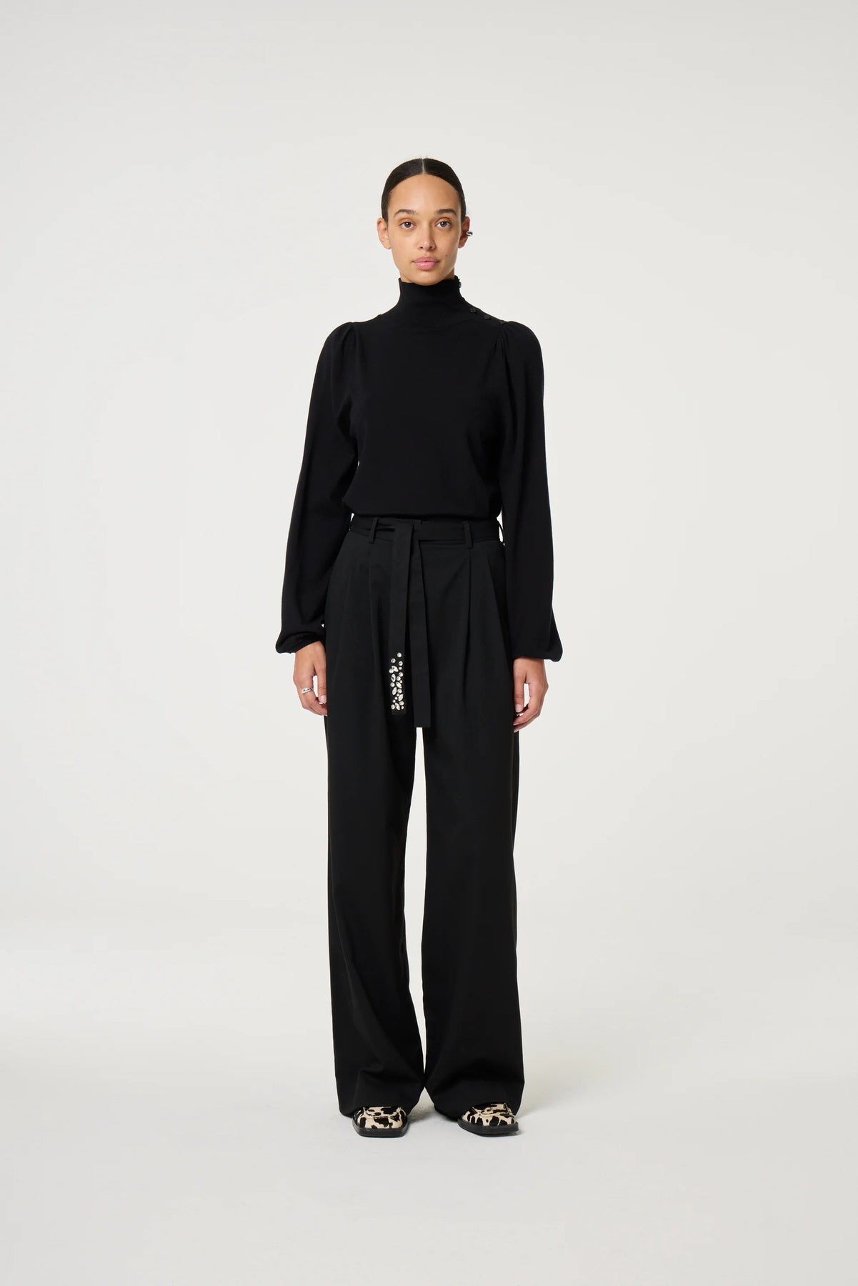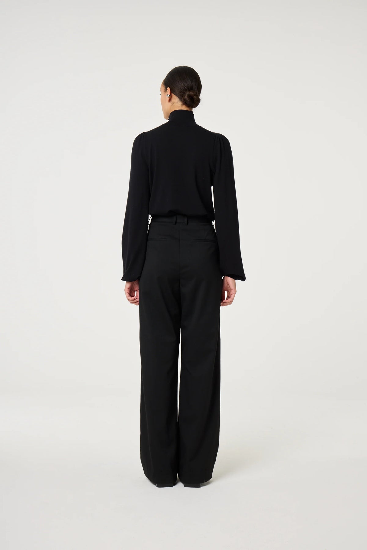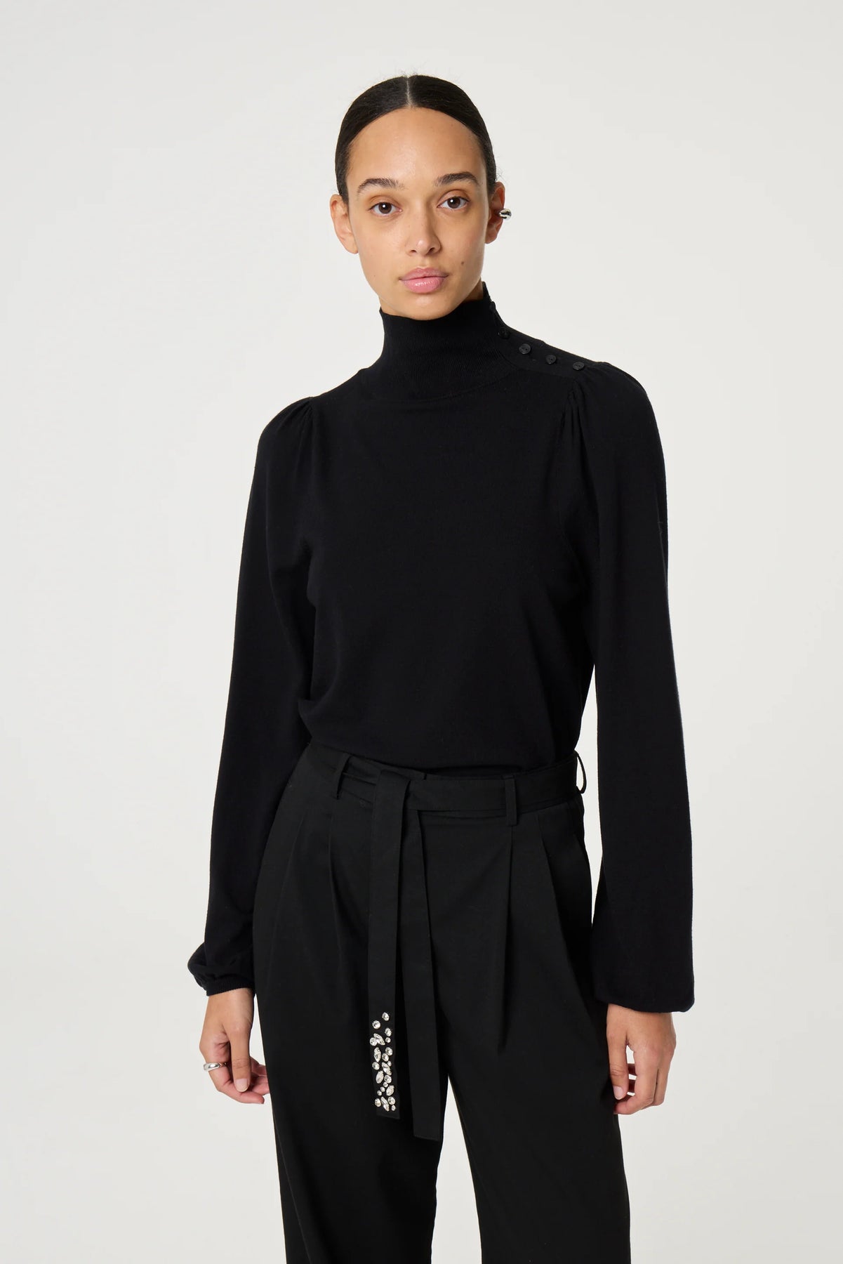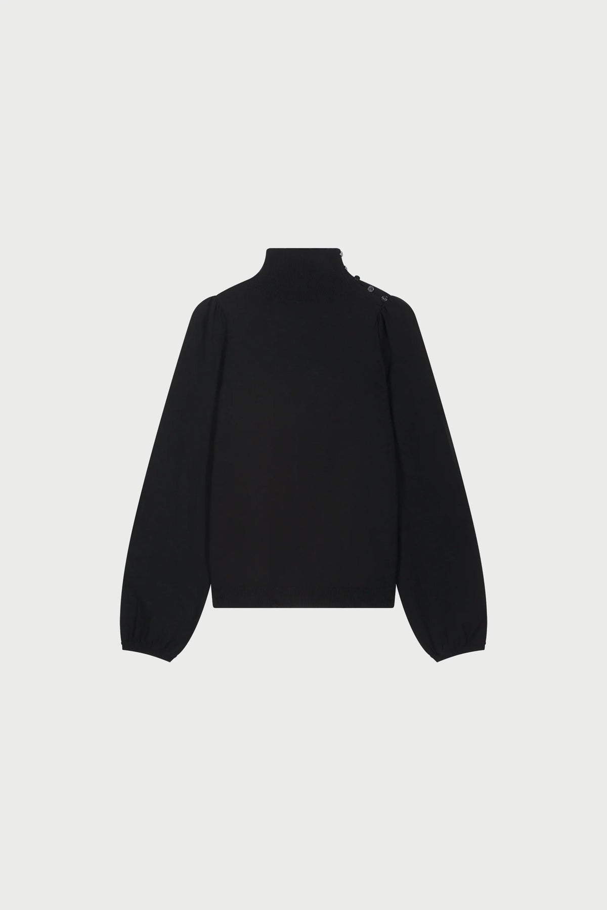 This pullover in black is a lightweight knit perfect for layering on crisp Autumn days. It drapes softly while keeping a refined shape. Its relaxed fit pairs effortlessly with skirts or jeans for a casual yet polished everyday look.