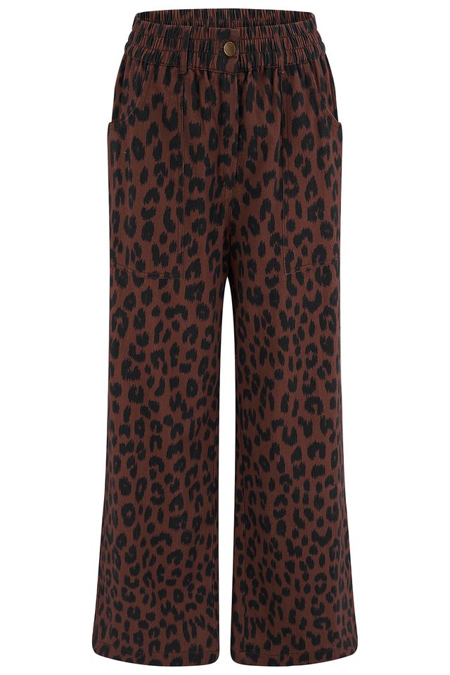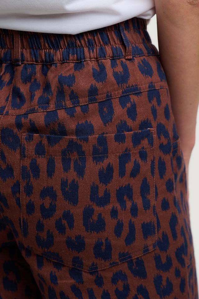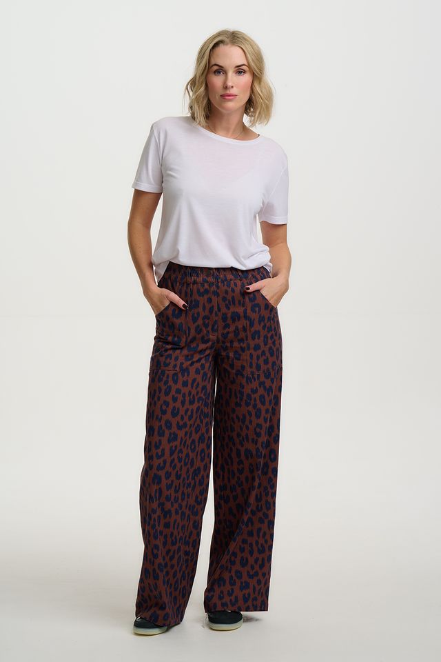 Elasticated wide leg trousers that are soft in this lovely combination of rust and navy blue leopard.