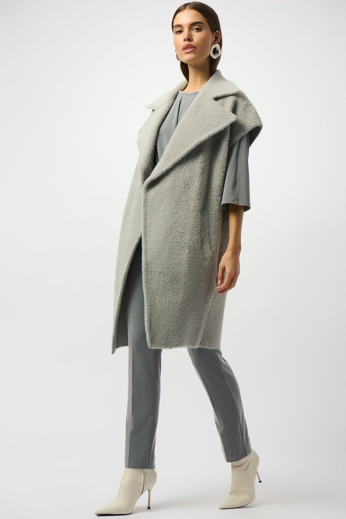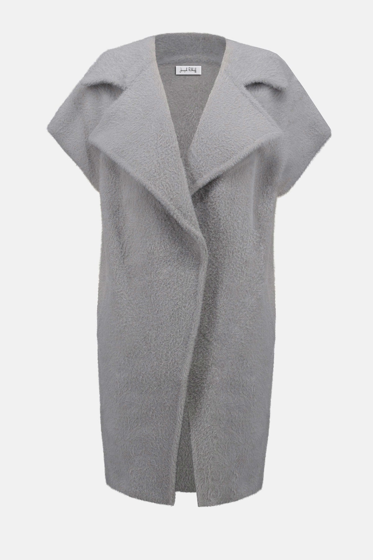 Indulge in the textured coziness of this open-front sweater vest, crafted from feather yarn for a warm, inviting feel. Featuring short dolman sleeves and a notched collar, it’s a perfect blend of comfort and elegant style for everyday wear. Side pockets add a practical touch, making this piece as functional as it is chic.