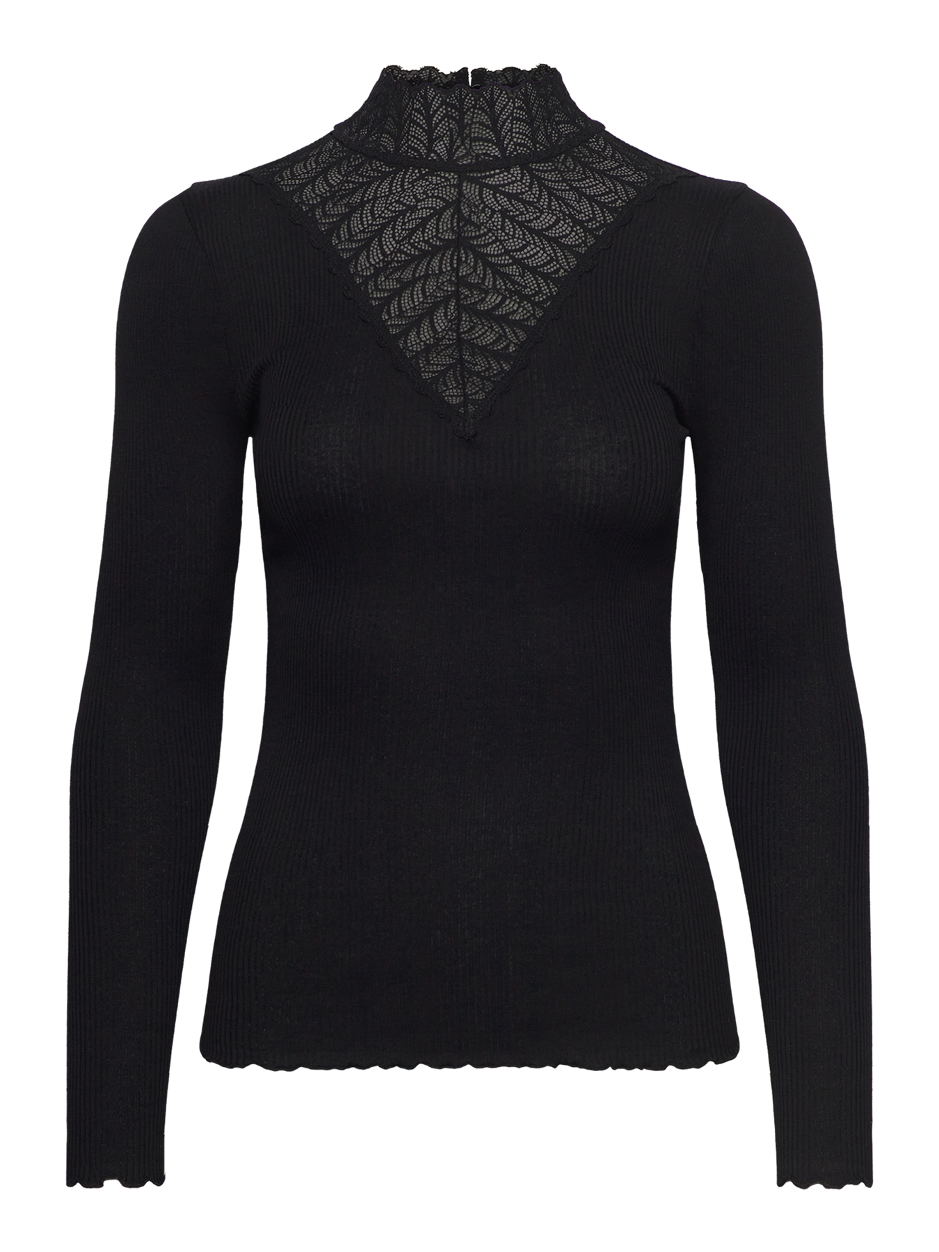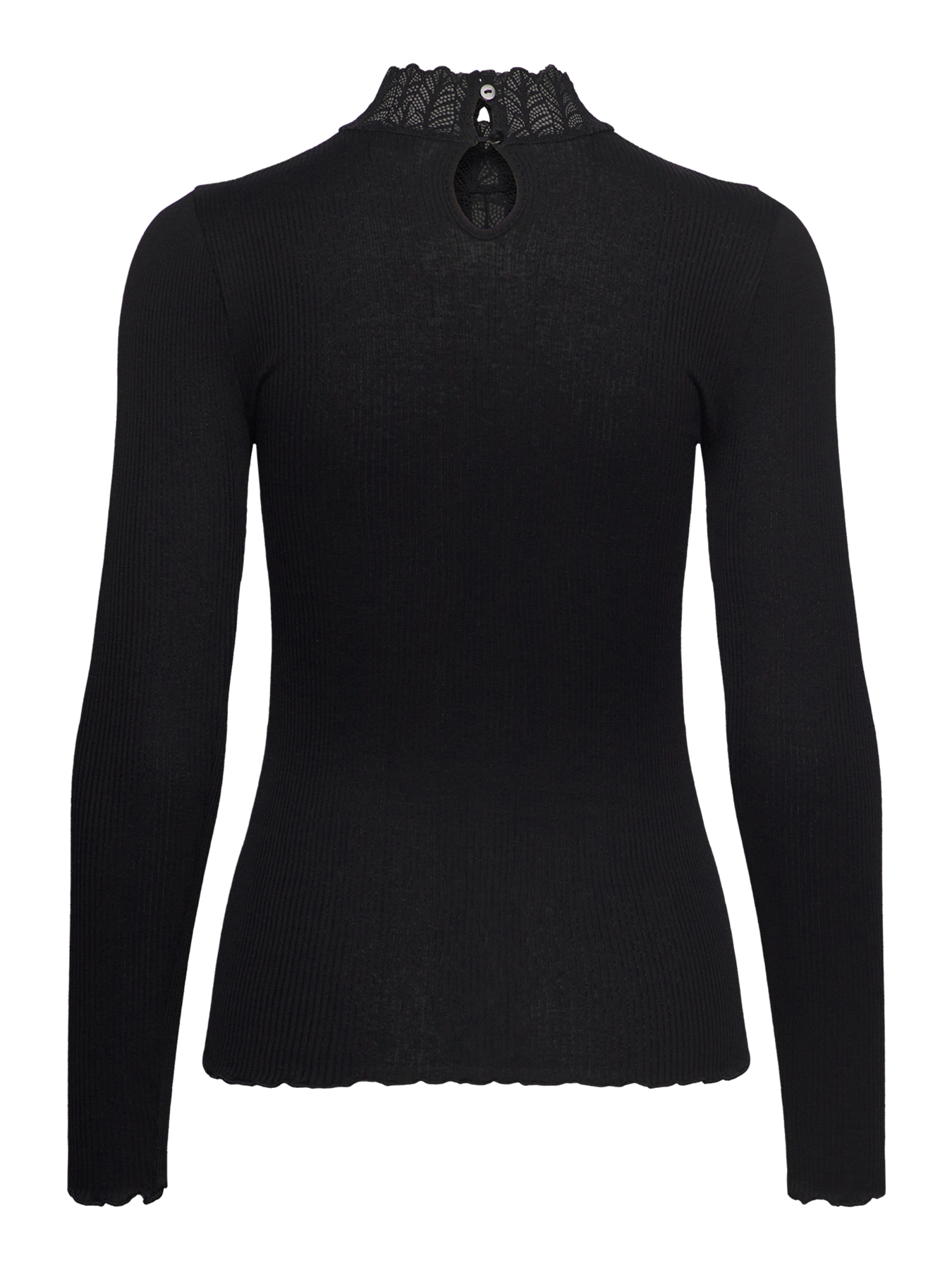 The RWBeatha Silk LS Lace T-shirt is a long-sleeved blouse crafted from a soft silk and cotton blend. It is designed with delicate lace along the V-neckline that gracefully continues up to a high neck. A modern and luxurious wardrobe essential that combines comfort with delicate design.