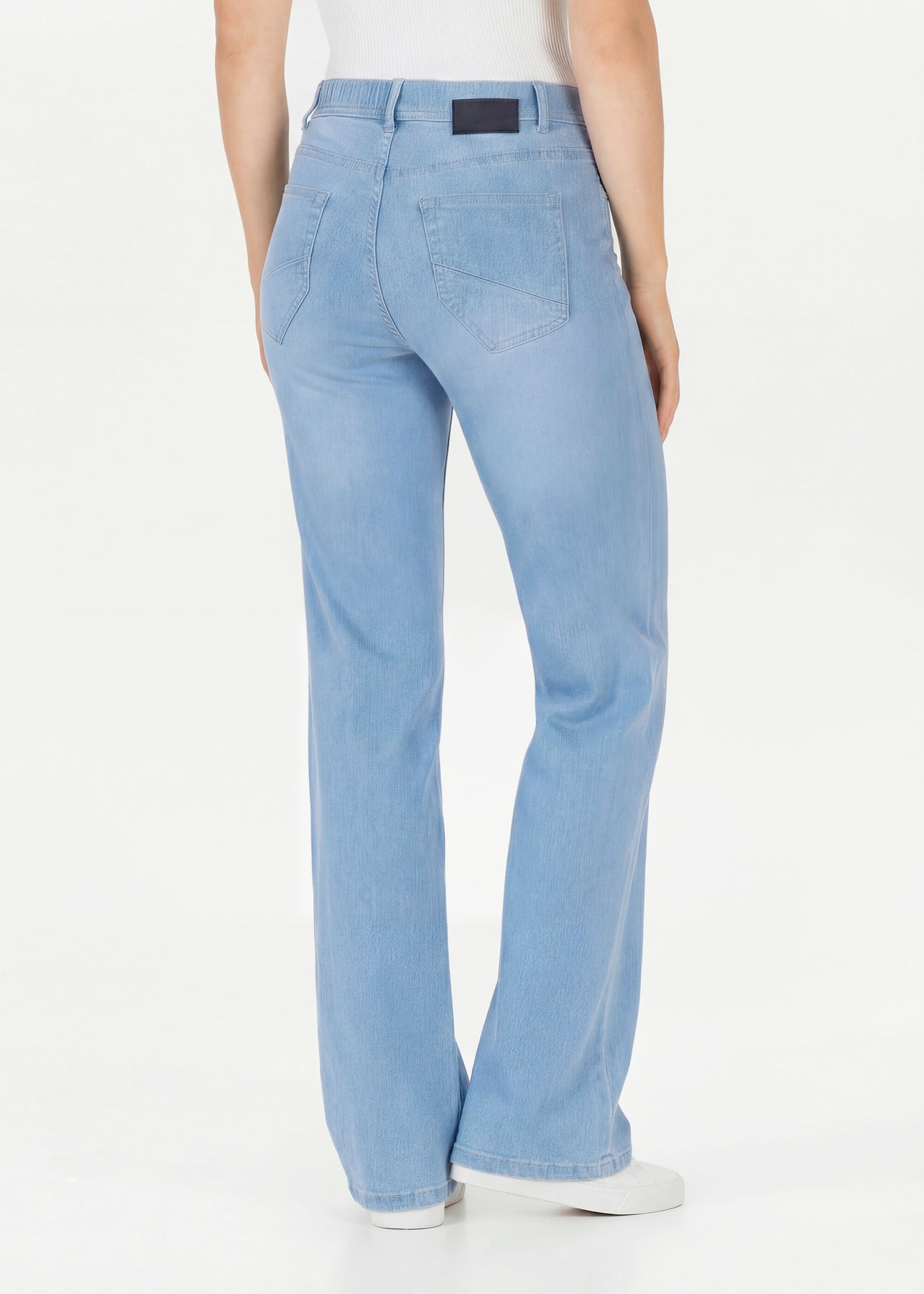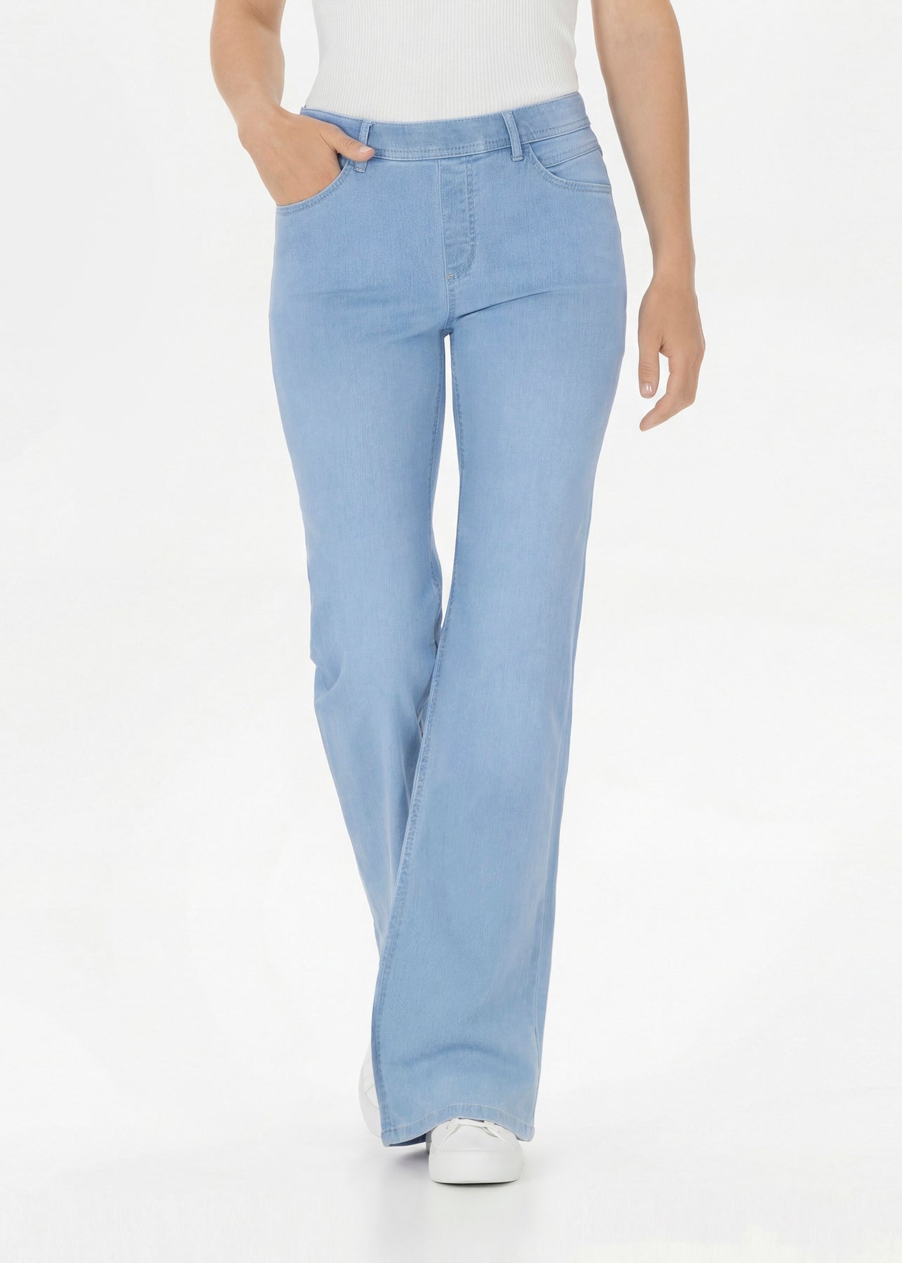 Ice blue denim jeans which are perfect for the warmer months. Slightly flared at the ankle so a great for lengthening the leg. Soft, stretchy and very comfortable. These are not a pull on style, they have a button and fly fastening.