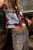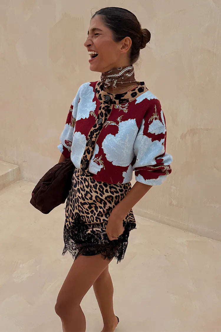 The weighty, soft touch knit fabric makes this cardigan feel so luxe and premium! A burgundy base with our iconic, bright and bold poppy print in a contrasting baby blue. With wide sleeves for a slightly oversized, boxy look and leopard print along the neckline and button stand adding an extra touch of NFD flare, pair this cardi with some barrel jeans or thrown over the matching mesh dress for a classic day to night outfit.