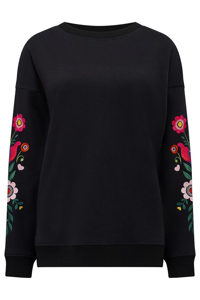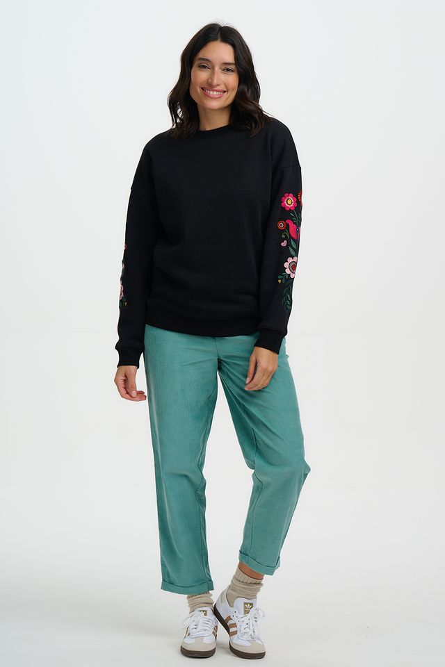 Relaxed, bold, and irresistibly soft — the Eadie Oversized Sweatshirt is made from 100% Cotton Jersey for ultimate comfort. This crew neck sweatshirt features bright folk-art florals with layered petals, leafy stems, and tiny hearts arranged in a tall, decorative vertical motif on a black base. The drop shoulders and oversized fit create a laid-back silhouette, while the super soft interior makes it perfect for all-day wear. Style it with jeans or joggers for easy, everyday cool.