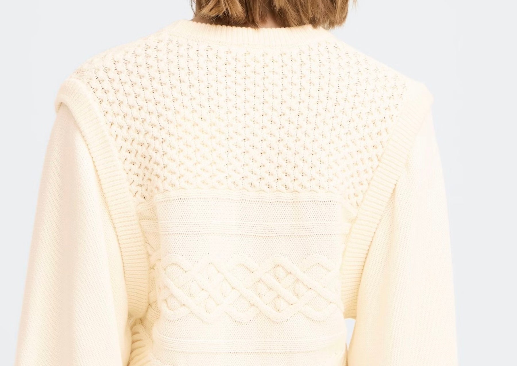 Chunky knit sweater features an intricately textured front, dropped shoulders and a straight silhouette. Crew neckline and ribbed cuffs complete this cool, confident style, balancing structure with subtle softness.