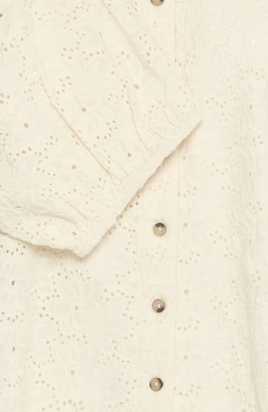 This soft ivory blouse features a subtle textured finish and a ruffled high neckline that adds delicate charm. The front button closure and long voluminous sleeves with gathered cuffs balance structure and relaxed style for everyday wear. Perfect paired with a knitted waistcoat and skirt, it creates an effortlessly feminine and fashionable outfit.