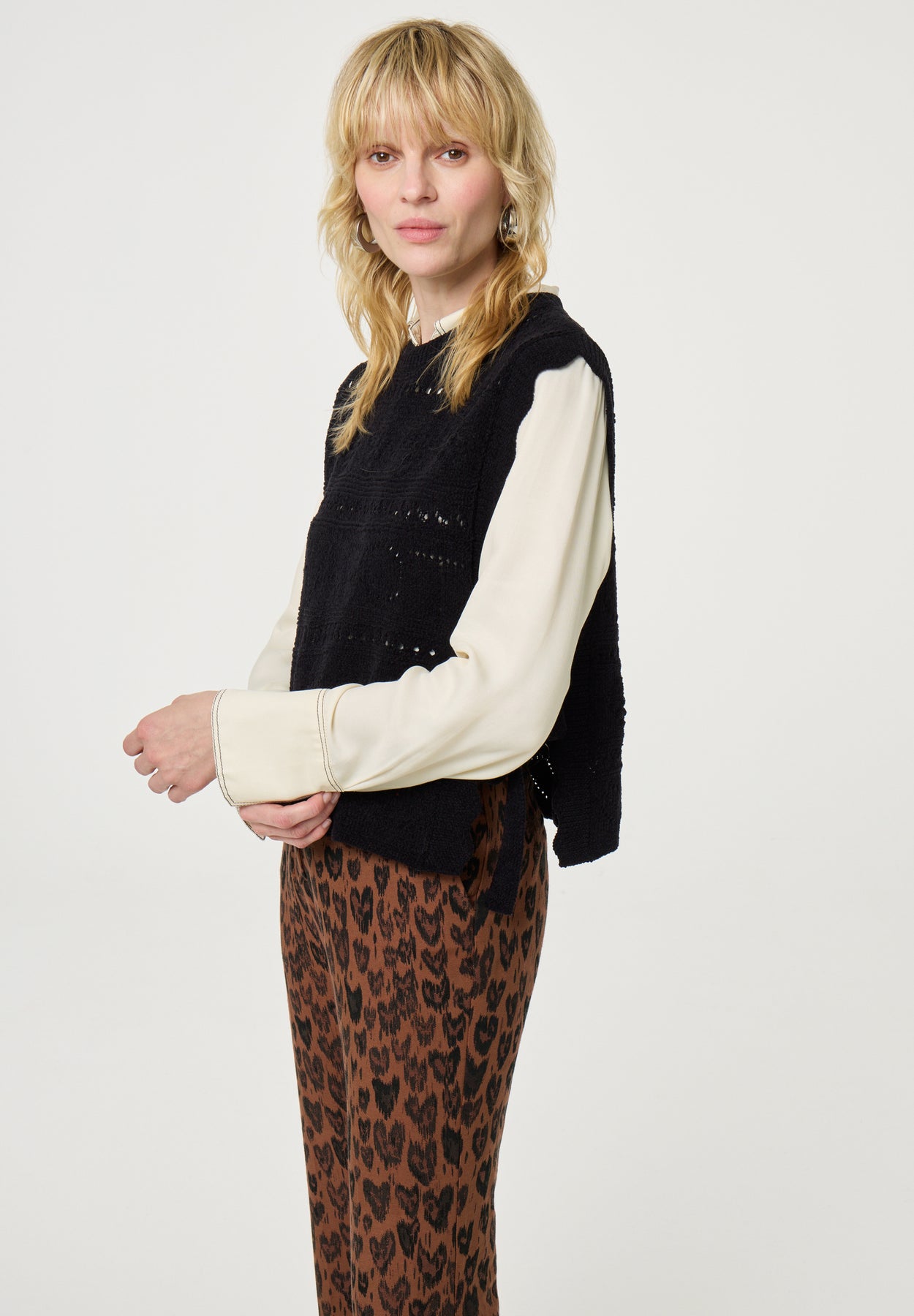 This cropped knitted top, made from a cotton-viscose blend, features embroidery and a stitched logo on the front. Side tie details add a playful touch. Style it over a basic T-shirt or blouse for a fun and modern layered look.
