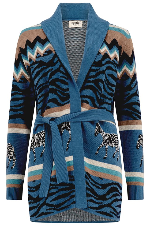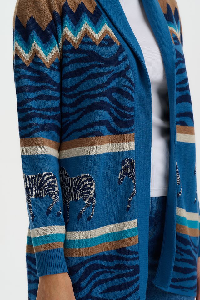 The Saira Cardigan is a bold yet wearable statement knit, designed with an easy open-front silhouette and relaxed fit. Featuring rows of marching zebras set across layered green and blue stripes, it’s finished with soft geometric borders for a polished touch. Perfect for layering over simple tees and denim, Saira brings playful pattern and cosy comfort to everyday dressing.