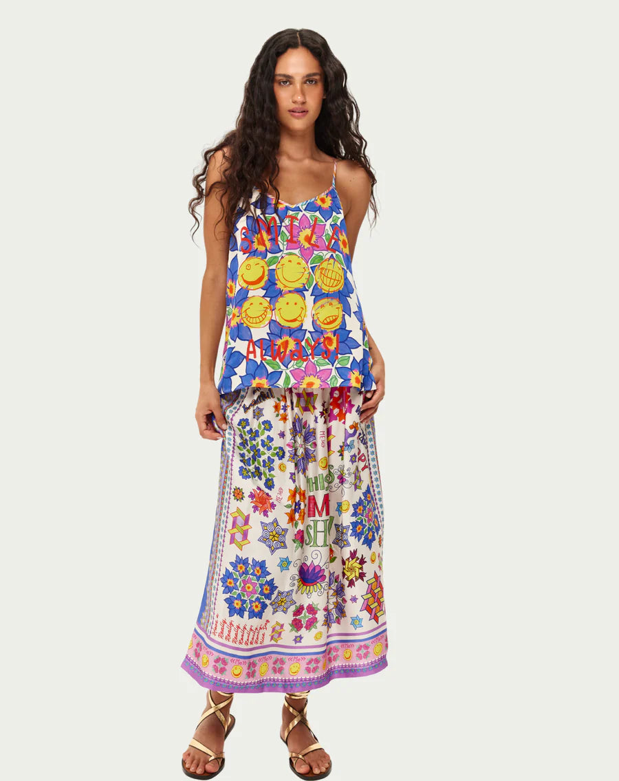 Radiate happiness with the Angelique camisole from our Markers collection, featuring bright yellow smiley faces across a bold blue geometric star pattern. printed flowers in pink, orange, and yellow blend with playful "ALWAYS!" lettering in red and orange.