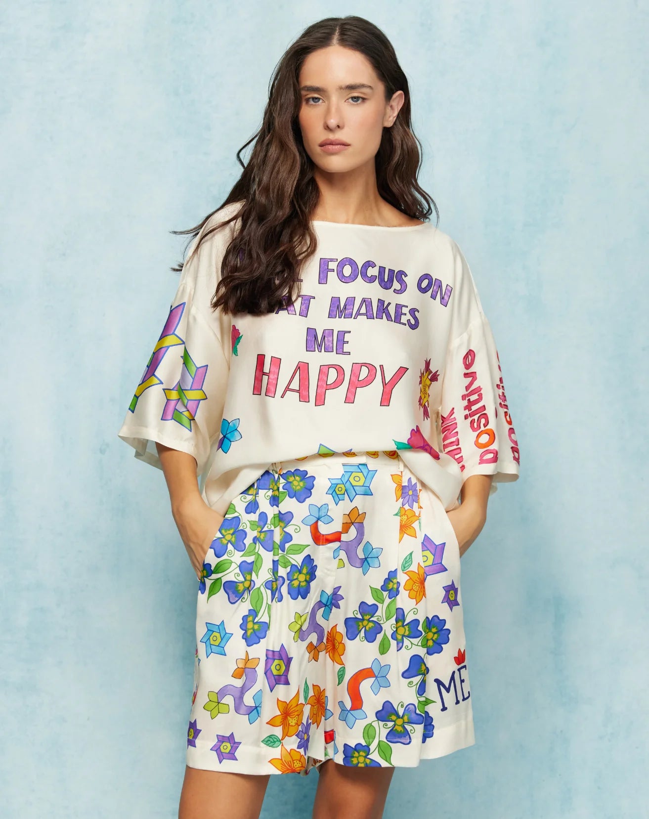 Bloom with color in the Dina pleated shorts featuring large hand-painted flowers in blue, orange, purple, and yellow across a cream base. Sharp geometric shapes and playful curved lines blend with organic florals, while "ME" lettering adds personal flair.