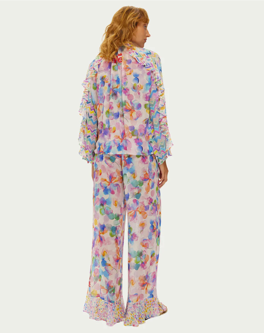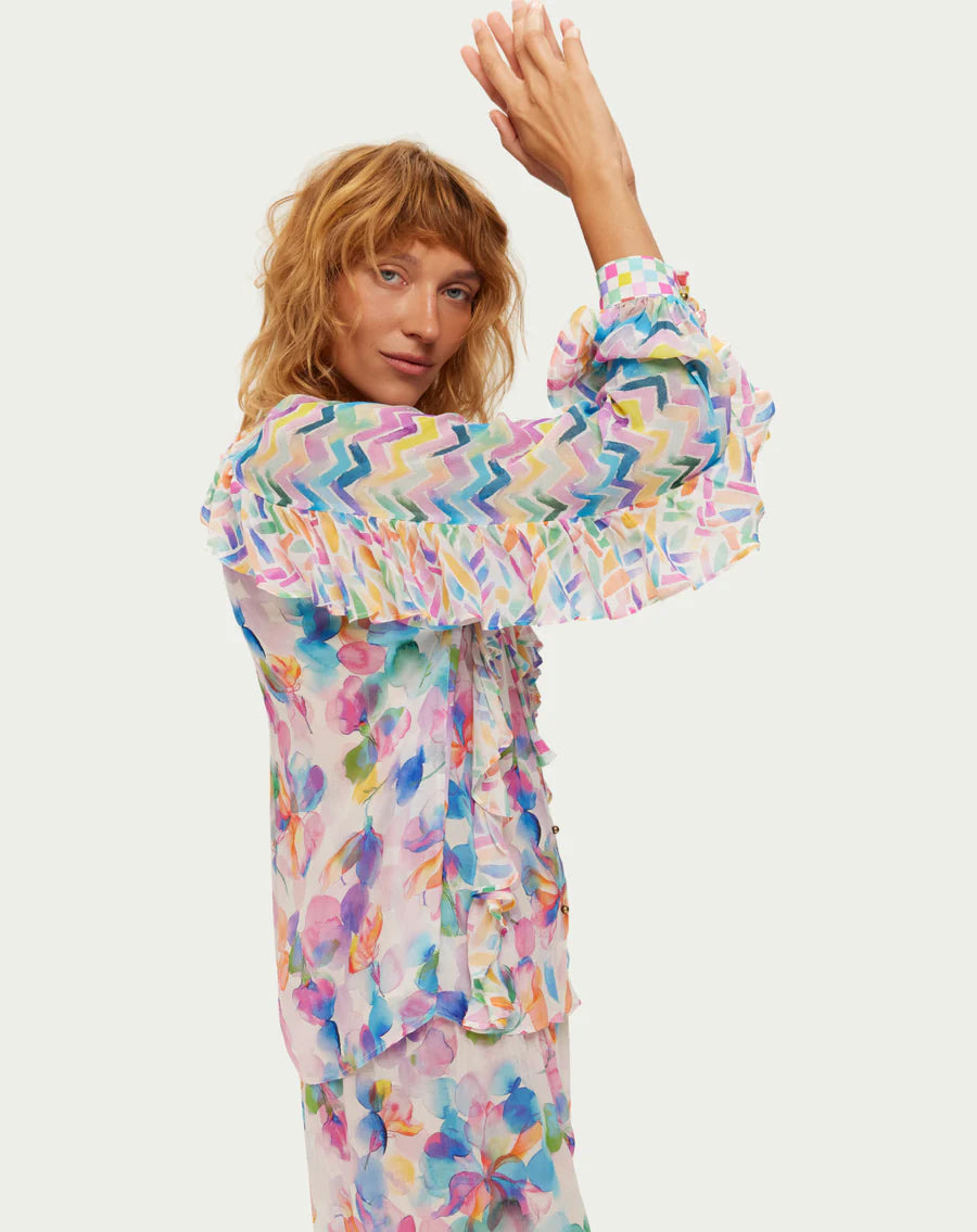 Pure joy in every detail. The Holly blouse features a dreamy watercolor floral pattern in pinks, purples, blues, and yellows. Dramatic ruffled sleeves with chevron trim, a charming tie neck, and cascading ruffles create show-stopping bohemian elegance.