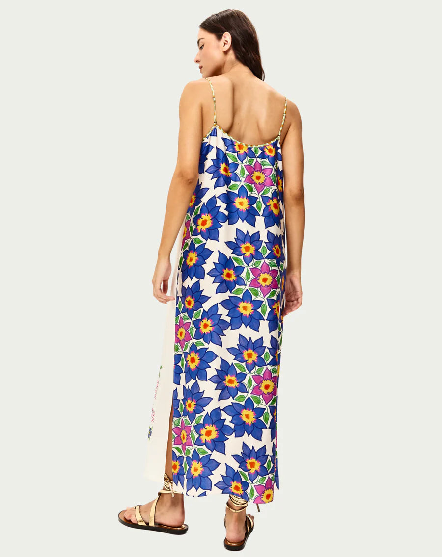 The back showcases a bold all-over floral pattern where blue blooms create a striking geometric arrangement. Delicate adjustable straps with decorative chain detail and flowing maxi silhouette with side slits offer effortless elegance.