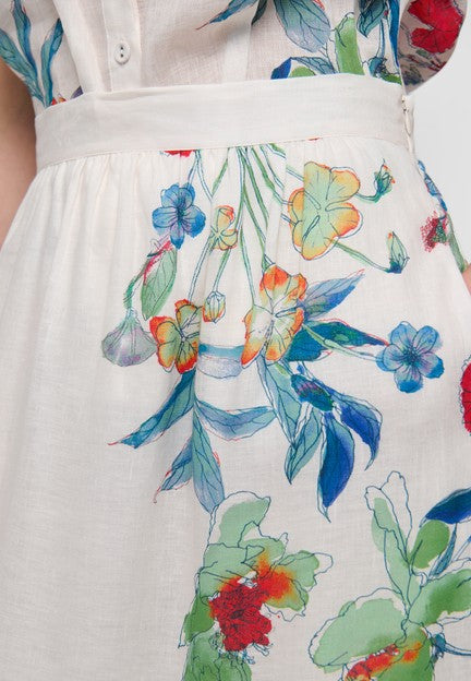 Painterly flowers cascade down this full length linen skirt. A deep flounce adds a further volume and a sense of ease to a skirt that works both for day and evening.