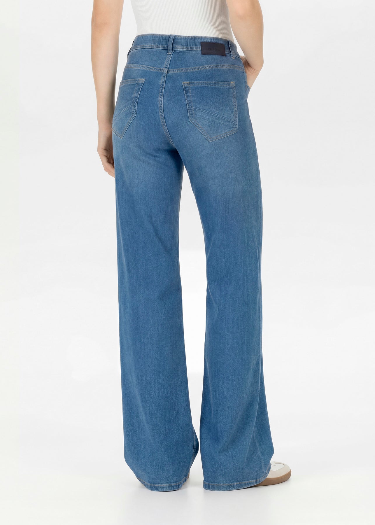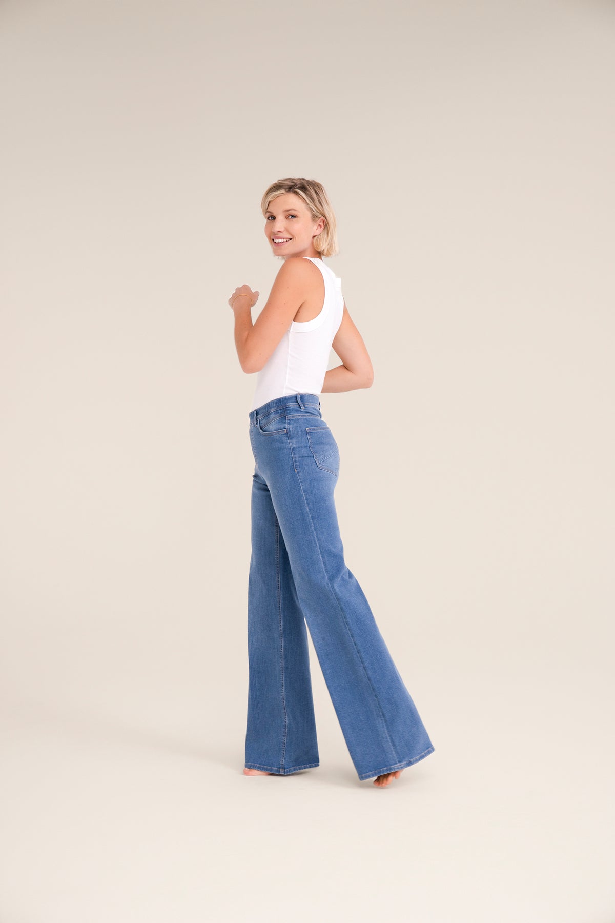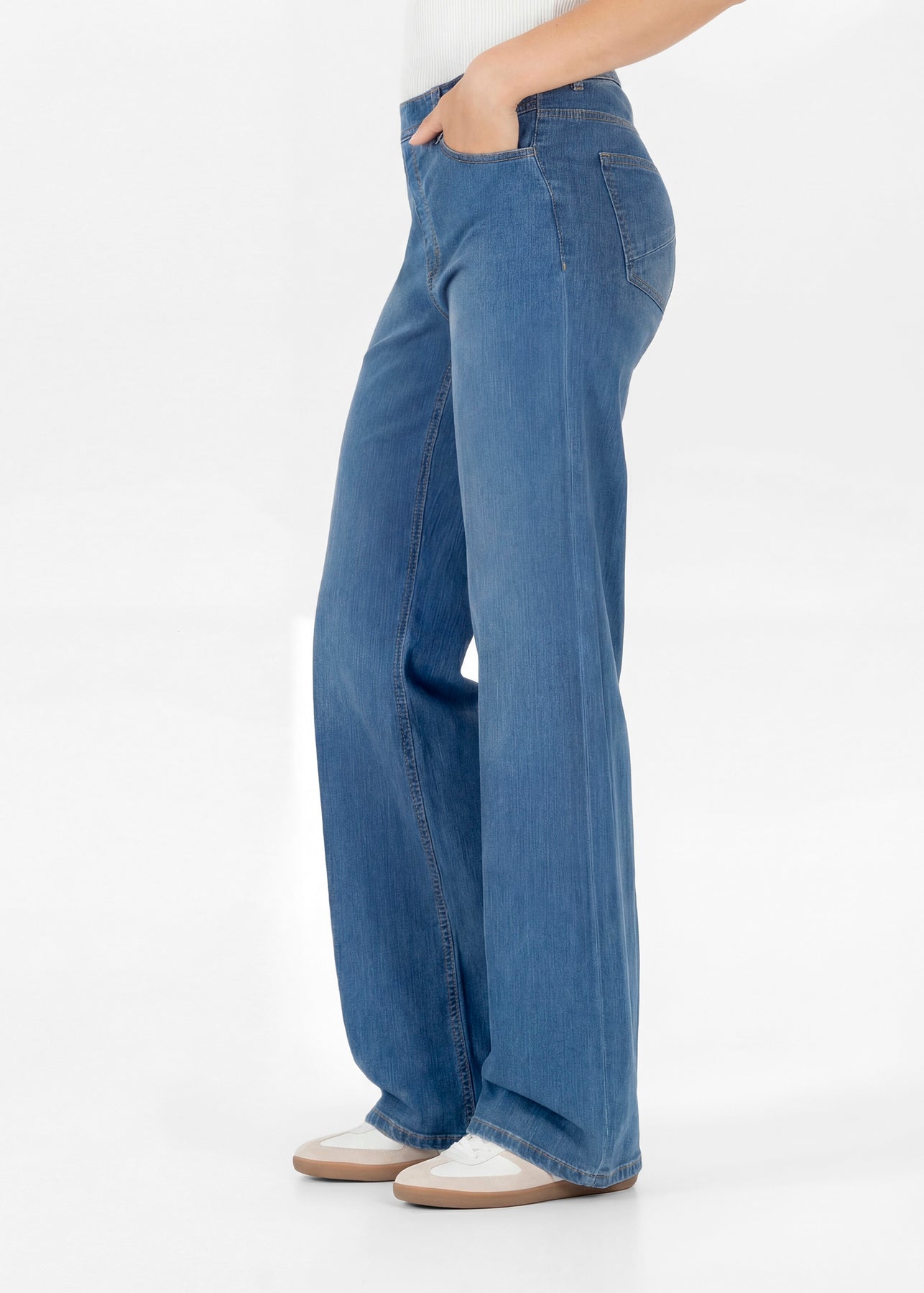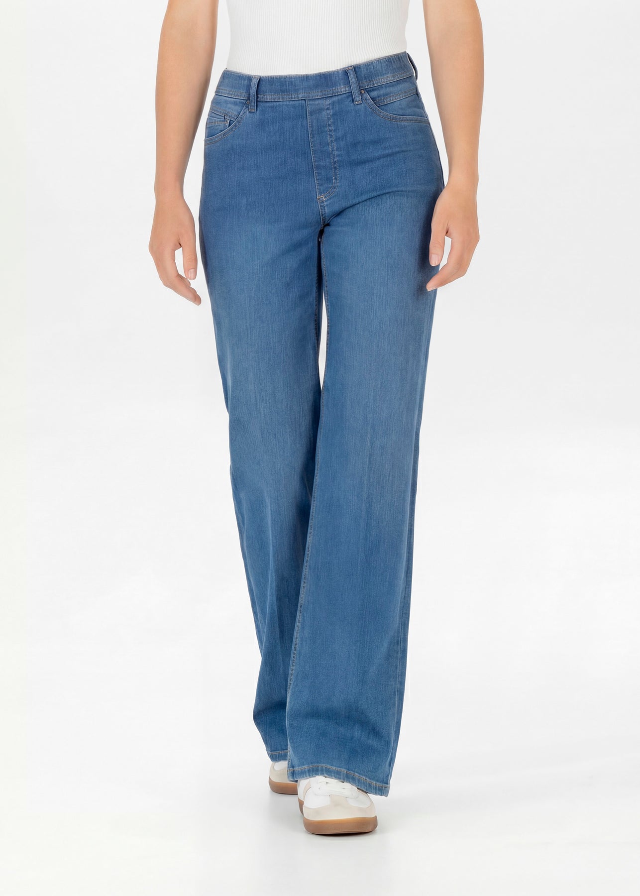 Mid blue, wide leg pull on jeans that really don't look like a pull on style! The Melli wide leg have front and back pockets and a soft and very stretchy.